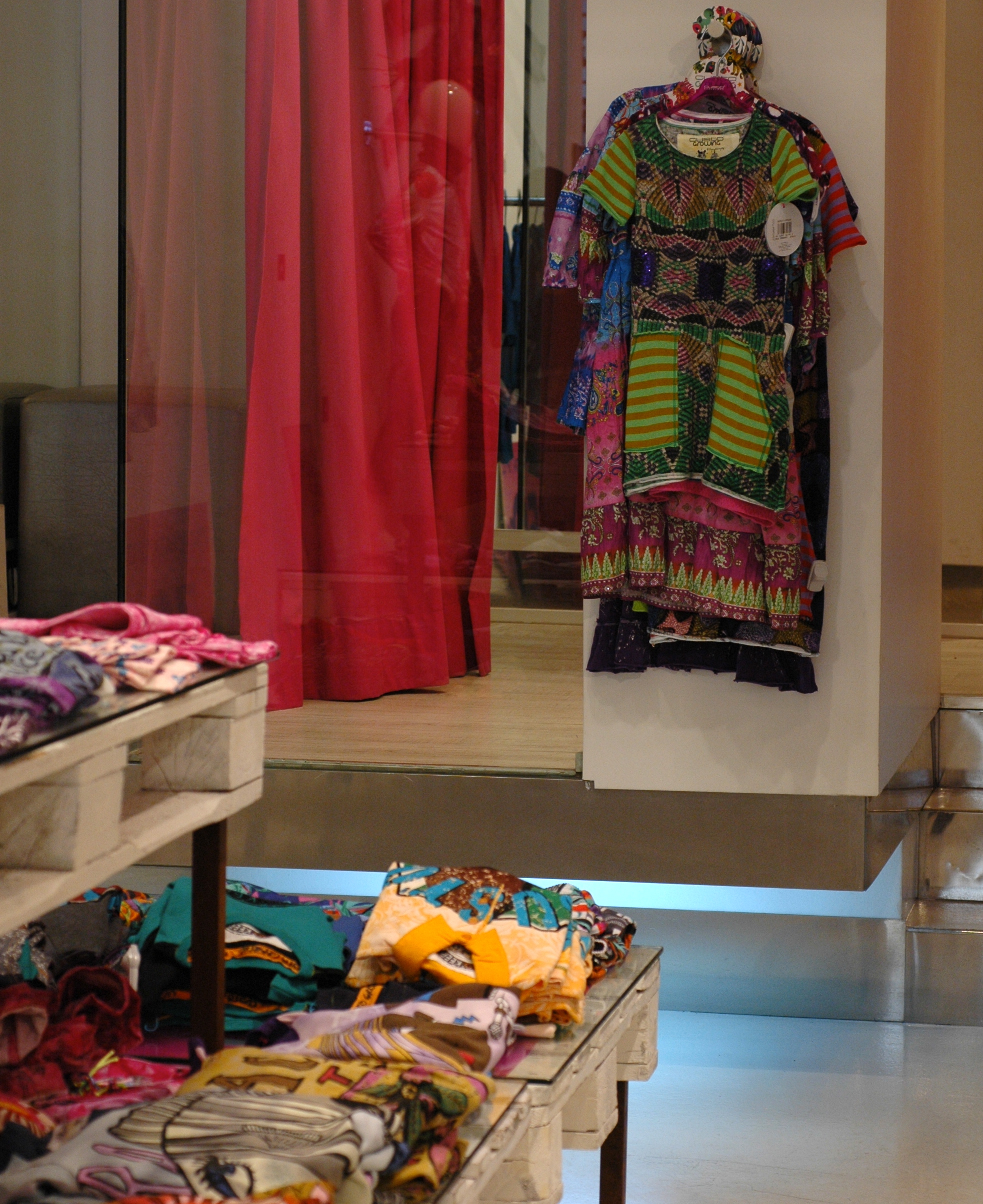 At Custo I liked the dresses and tops and was surprised about the sizing. The sizes run from 1 to 4, 1 being 34 or 36 (size 4 in US) and 4 being 44 or 46 (size 16 in US). I observed something similar at Desigual, where the smallest size the store had was 38 and it only carried from 38 through 44 (6 through 14 in US sizes). Things are changing in Barcelona.