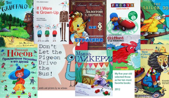 Today I asked my five-year-old daughter to select her ten most favorite books. I used to document her liking in books every year in my note book, but with all the moving between countries those notes are not easy to find now. Thus, I decided to create a page on my blog to document some of her liking, ideas and thoughts.